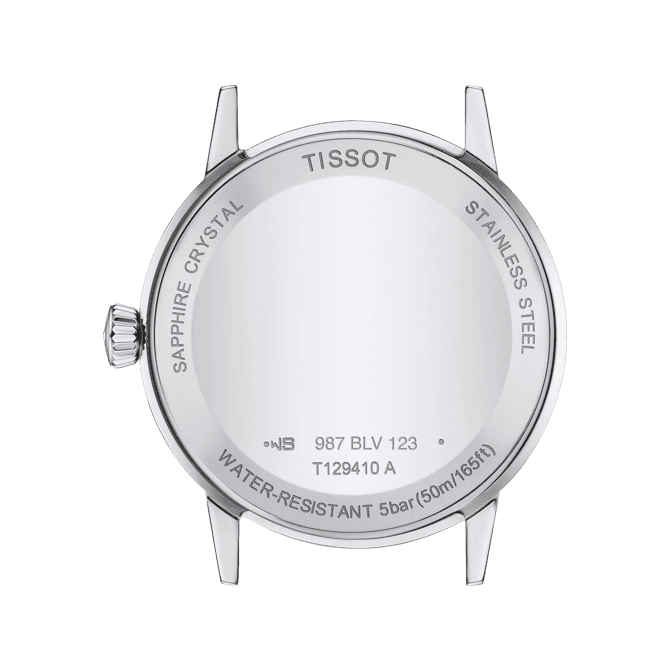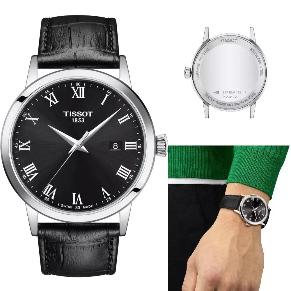 The Tissot Classic Dream T129.410.16.053.00 has a Quartz movement with 5 Bar (50 meters) of water resistance, Black dial color, Stainless Steel case material and Black Leather Strap.
