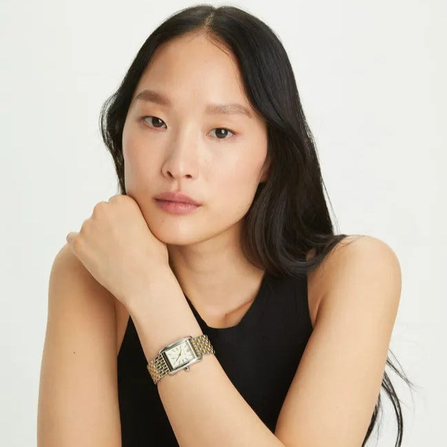 Elegant with clean lines, the THE ELEANOR watch features a geometric case and a double-T logo clasp. It's paired with a classic stainless steel link bracelet. Tory Burch's elegantly structured Eleanor watch features a minimalist dial and stainless steel bracelet.